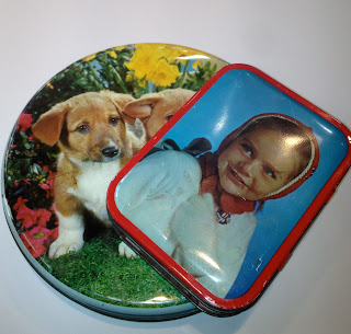 Kitsch vintage tins featuring scary puppies and children, from a large selection , various prices starting from £2.00